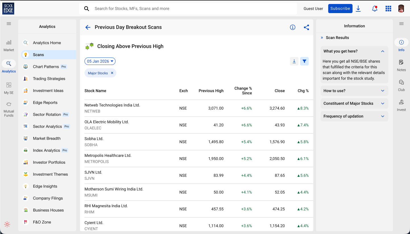 StockEdge offers discovery through predefined scans, quantitative filters, and model-based lists, which effectively act as discovery mechanisms for traders.
