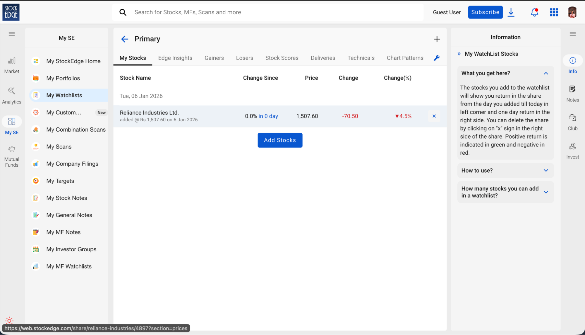 StockEdge supports watchlists and tracking, but the experience lacks narrative context and does not match the depth or clarity of Multibagg AI’s timeline-driven tracking.