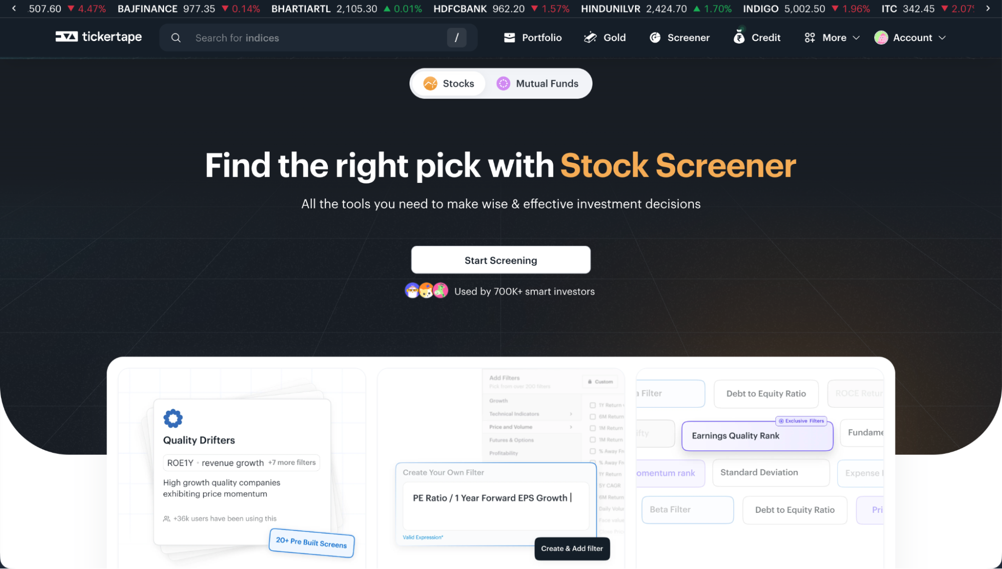 Tickertape has a screener with a decent range of filters but is largely limited to stocks and mutual funds. It lacks sectoral and industrial screeners. The experience is rigid, number-heavy, and offers limited flexibility. There is no AI or natural-language screening, and moving from screening to real insight takes effort.