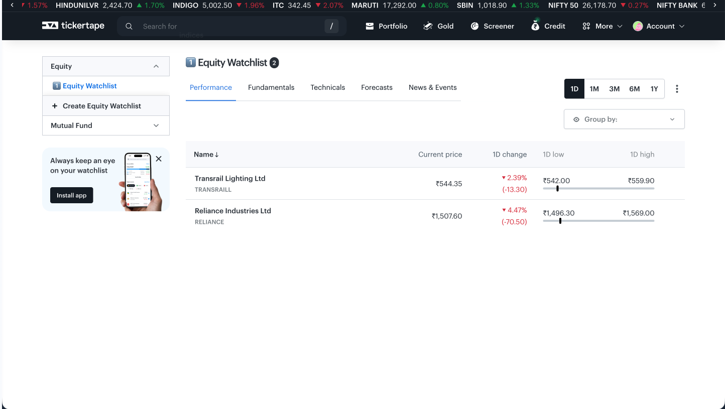 Tickertape allows watchlists and alerts, but the experience is shallow. Too much information is packed into each stock, making it harder to get a quick overview.